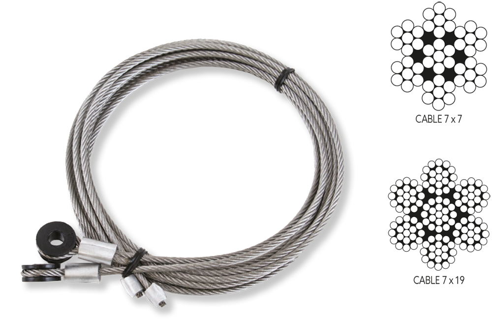 - Construcción de cable aeronáutico de 7 x 7 ó 7 x 19 de gran resistencia y 0,125” de diámetro.
